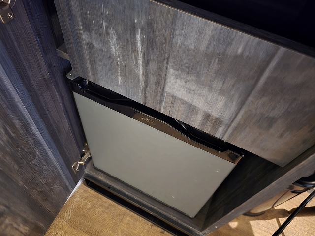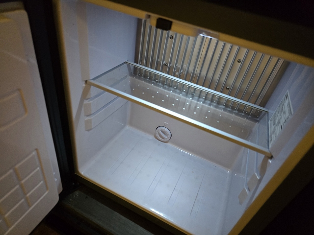 部屋に入って左にデスクやらポット、コップや冷蔵庫(からっぽ)もありました。